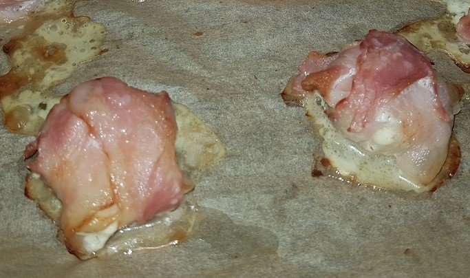 Tämän jälkeen kääri sienet pekoniin, n. 1-2 kappaletta/sieni, riippuen niiden koosta. Koko sienen tulisi peittyä näkyvistä, eli pekonia voi kääriä myös sivuttain. Jos haluat varmistaa että annos pysyy kasassa, voit laittaa paketin kasaan esimerkiksi hammastikun avulla.